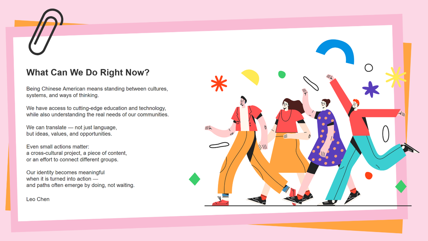 Leo Chen 以新生代大学生的视角,探讨“成功”的多元定义,并分享在专业选择、求职规划与身份认同上的观察。他鼓励美籍华裔学生跳脱传统框架,直面困惑、拥抱不确定性,将身份认同化为行动——无论是跨文化项目、内容创作或社群连结,都能为青年打开新的可能。他强调,成长来自探索与贡献,而非被动遵循剧本;未来需要大家主动行动与共同创造。